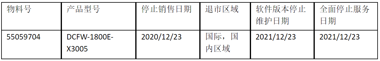北京神州数码泛亚电竞信息技术有限公司正式通知您, 以上DCFW-1800E-X3005下一代防火墙(55059704)将于2020年12月23号停止接收新的订单(具体日期见上表),不再供货。给您带来的不便,敬请原谅。