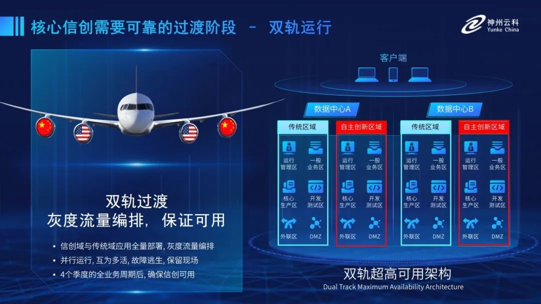 为帮助客户更好地应对数字经济时代对应用可持续性的高要求,实现信创与数字化兼得,神州泛亚电竞推出了双轨超高可用架构。双轨超高可用架构在双活数据中心的分区调度基础上,增加信创域和非信创域的分域调度,实行信创域与传统域应用全量部署,使双中心运营变为双中心四区域并行运行,互为多活,将传统架构变为分区分域协同的多活双轨超高可用架构。帮助客户在新架构下,保障“信创”的同时解决性能瓶颈,提升稳定性,保证应用可持续性,最终实现信创区域和非信创区域的平滑过渡,完成国产化替代目标。”